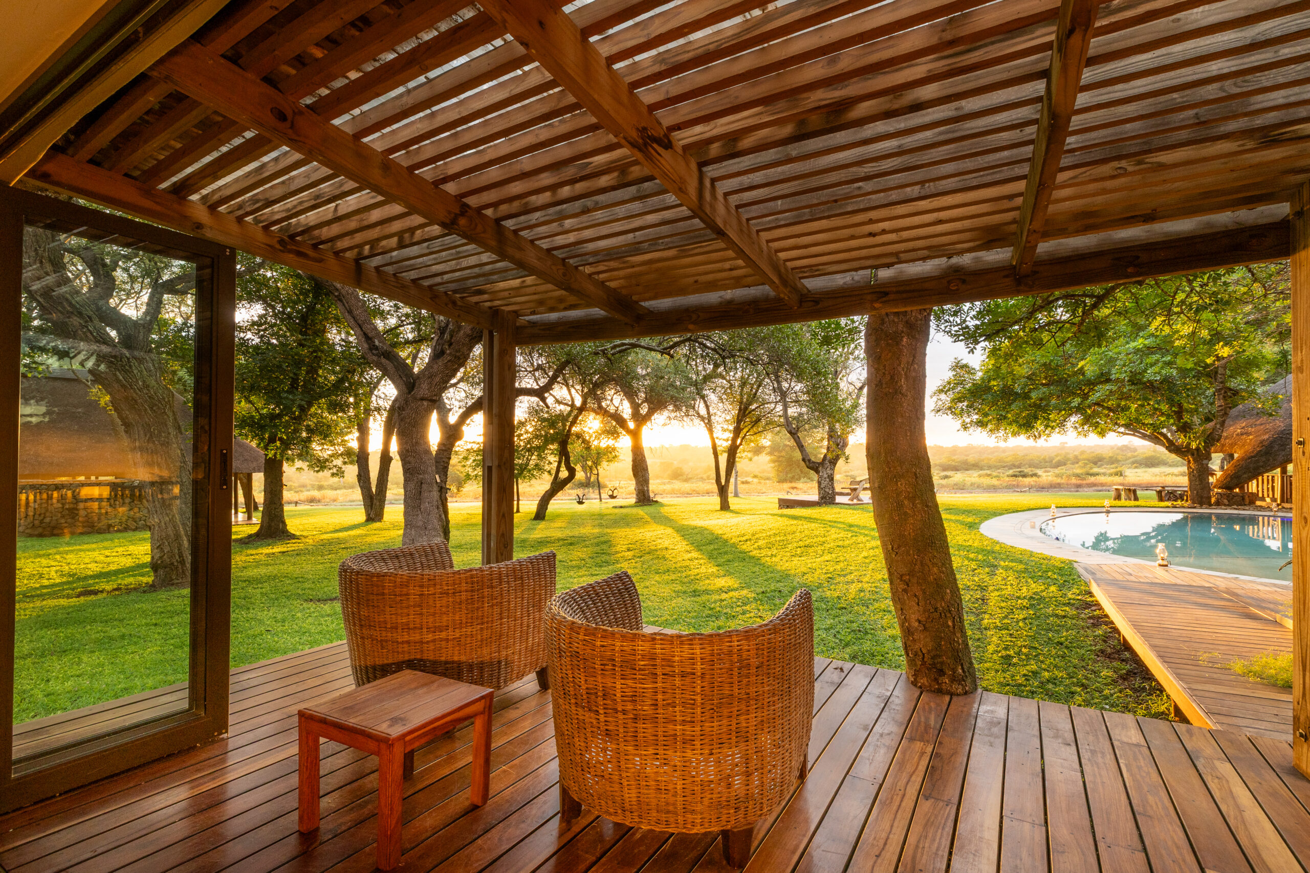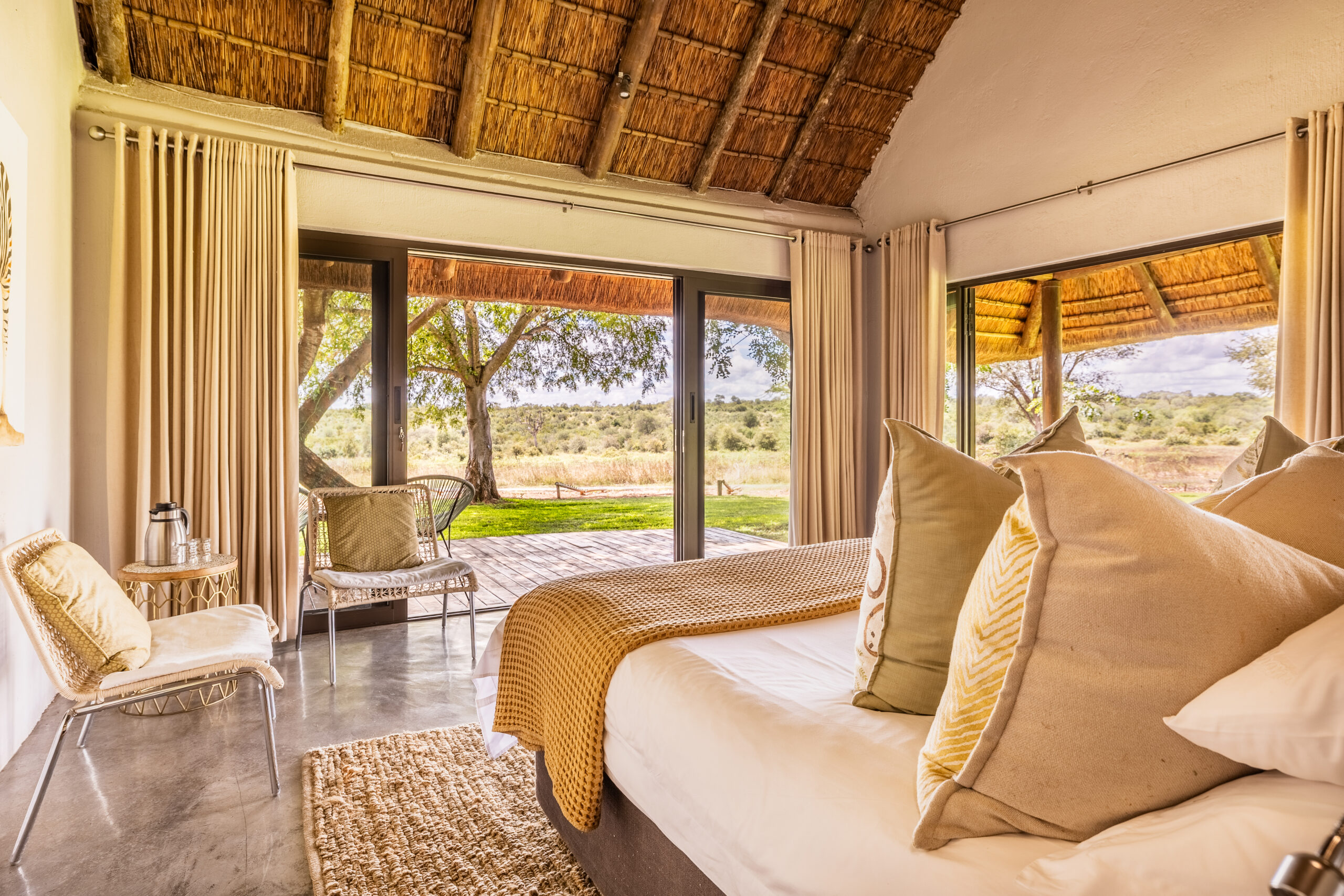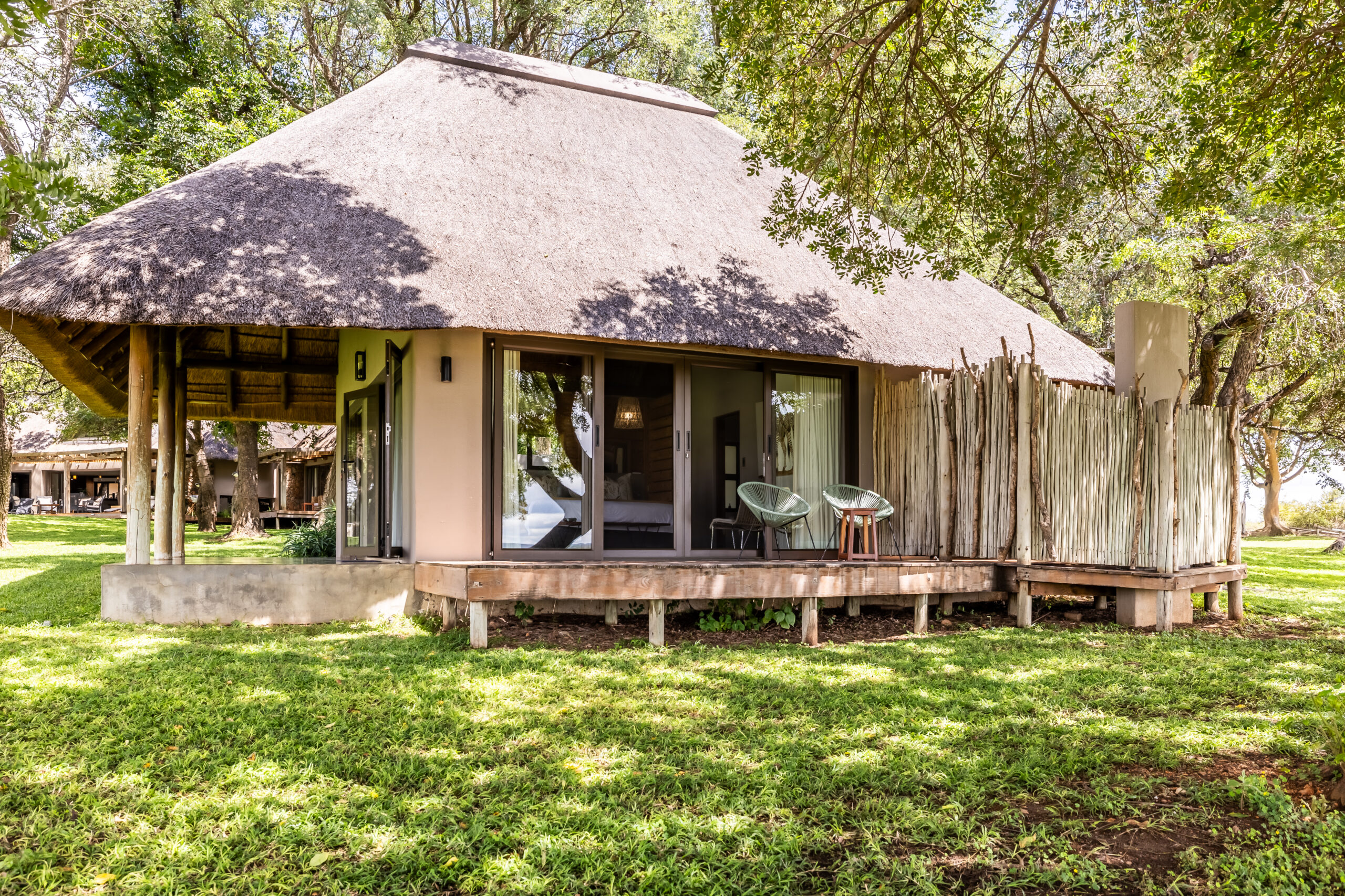 The lodge itself is fully fenced and surrounded by sweeping green lawns, offering both comfort and peace of mind while maintaining uninterrupted views of the surrounding bushveld. From sunrise coffee on the deck to evenings around the fire, Clive’s Camp invites guests to slow down, reconnect and experience the African wilderness in complete privacy.