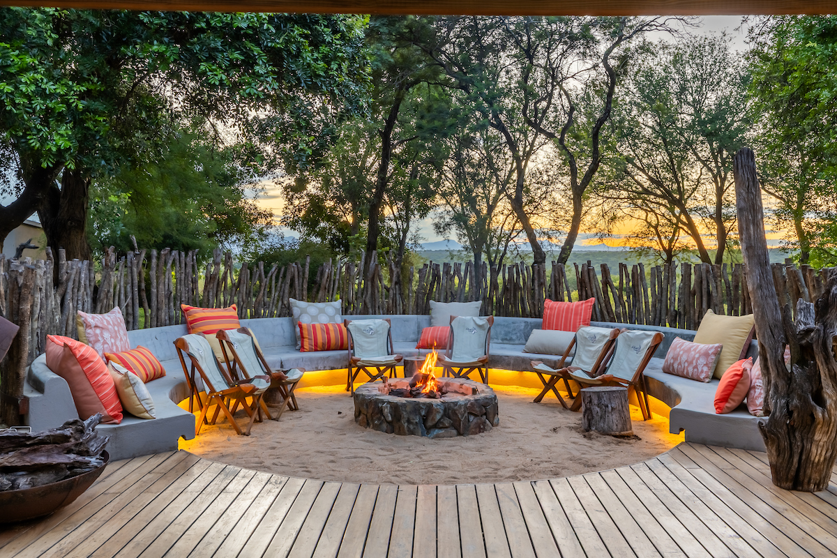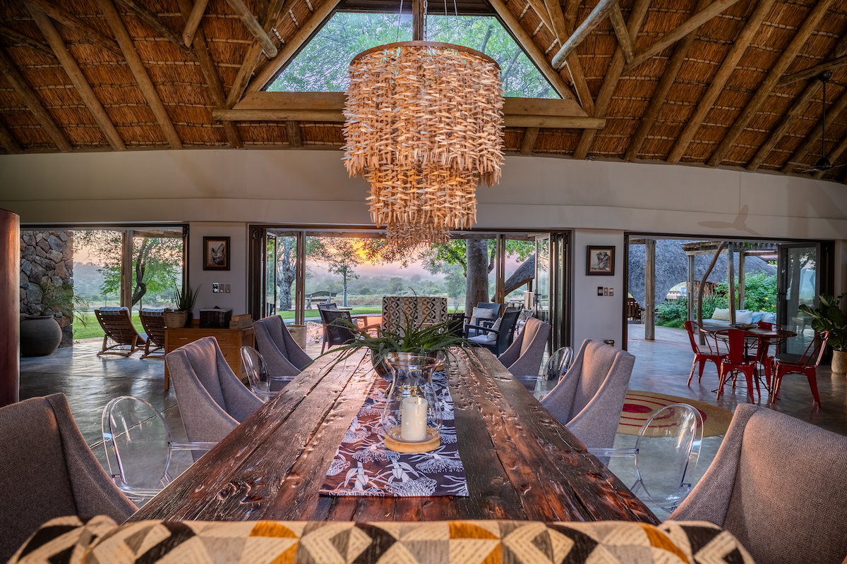 At the heart of the camp lies a spacious and beautifully designed open-plan main area, featuring a modern designer kitchen, lounge, dining space and a welcoming fireplace — creating a warm and inviting atmosphere where guests can relax and share stories of the day’s sightings.